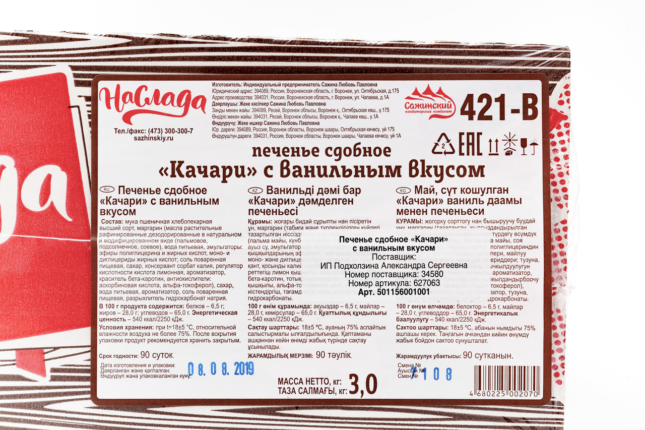 Вернуться назад Печенье НАСЛАДА Качари с ванилью сдобное, 3 кг Оставить отзыв Артикул: 627063 Поделиться В избранное Нет в наличии Посмотреть похожие Бренд НАСЛАДА Страна-производитель Россия Подробнее Описание Хранить при t от +15 до +21'C и относительной влажности воздуха не более75%. Полное описание Характеристики Бренд НАСЛАДА Страна-производитель Россия Нет в наличии Посмотреть похожие