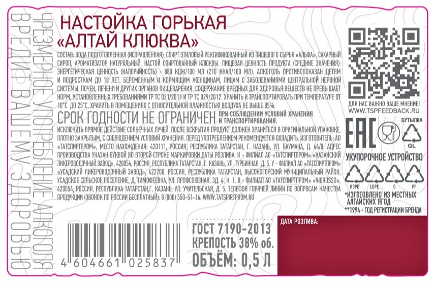 Настойка горькая Алтай черная клюква, 0.5л