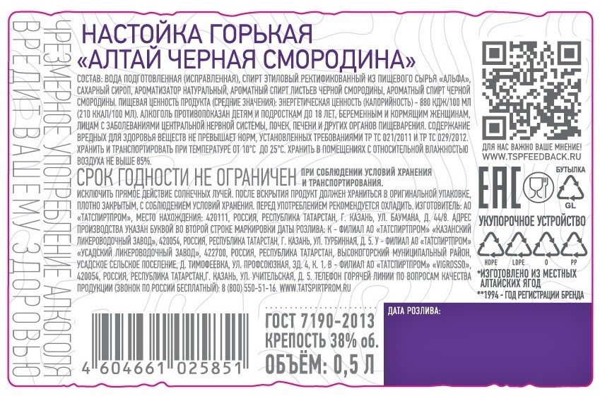 Настойка горькая Алтай черная смородина, 0.5л
