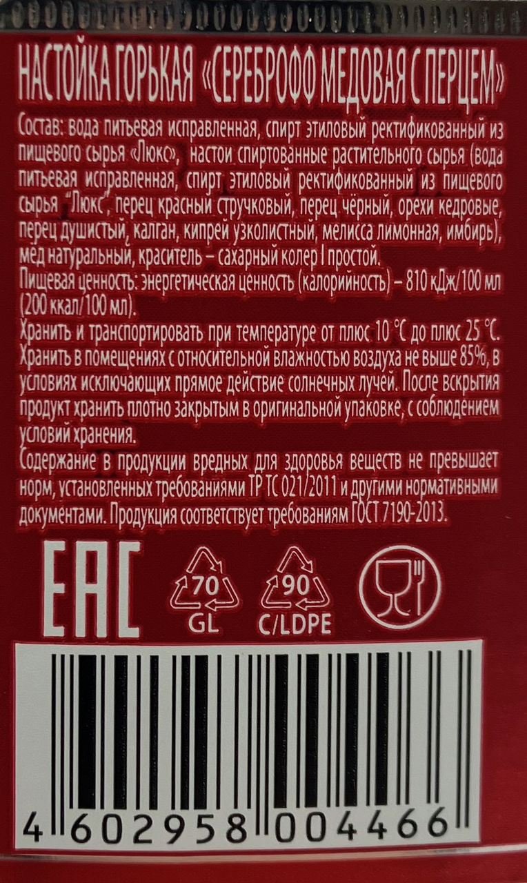 Вода питьевая исправленная, спирт этиловый ректификованный из пищевого сырья Люкс, настои спиртованные растительного сырья вода питьевая исправленная, спирт этиловый ректификованный из пищевого сырья Люкс, перец красный стручковый, перец чёрный, орехи кедровые, перец душистый, калган, кипрей узколистый, мелисса лимонная, имбирь, мёд натуральный, краситель-сахарный колер простой.