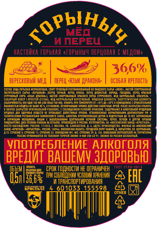 Вода питьевая исправленная, спирт этиловый ректификованный из пищевого сырья люкс, Настой спиртованный растительного сырья перцовый Перец черный, перек кубеба, перец душистый, корица, гвоздика, перец красный стручковый сорта Язык дракона настой спиртованный красного перца стручкового, мед натуральный, краситель - сахарный колер I простой Е150А.