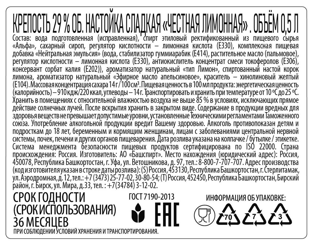 Вода подготовленная исправленная, спирт этиловый ректификованный из пищевого сырья Альфа, сахарный сироп, регулятор кислотности - кислота лимонная Е330, комплексная пищевая добавка Нейтральная эмульсия вода, стабилизатор гуммиарабик Е414, растительное масло пальмовое, регулятор кислотности лимонная кислота Е330, антиокислитель концентрат смеси токоферолов Е306, консервант сорбат калия Е202, ароматизатор натуральный тип Лимон, спиртованный настой корок лимона, ароматизатор натуральный Эфирное масло Апельсиновое, краситель - хинолиновый жёлтый Е104.