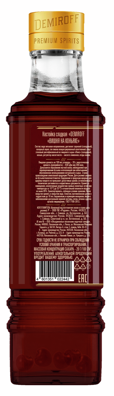 Настойка сладкая Demiroff вишня на коньяке, 0.5л
