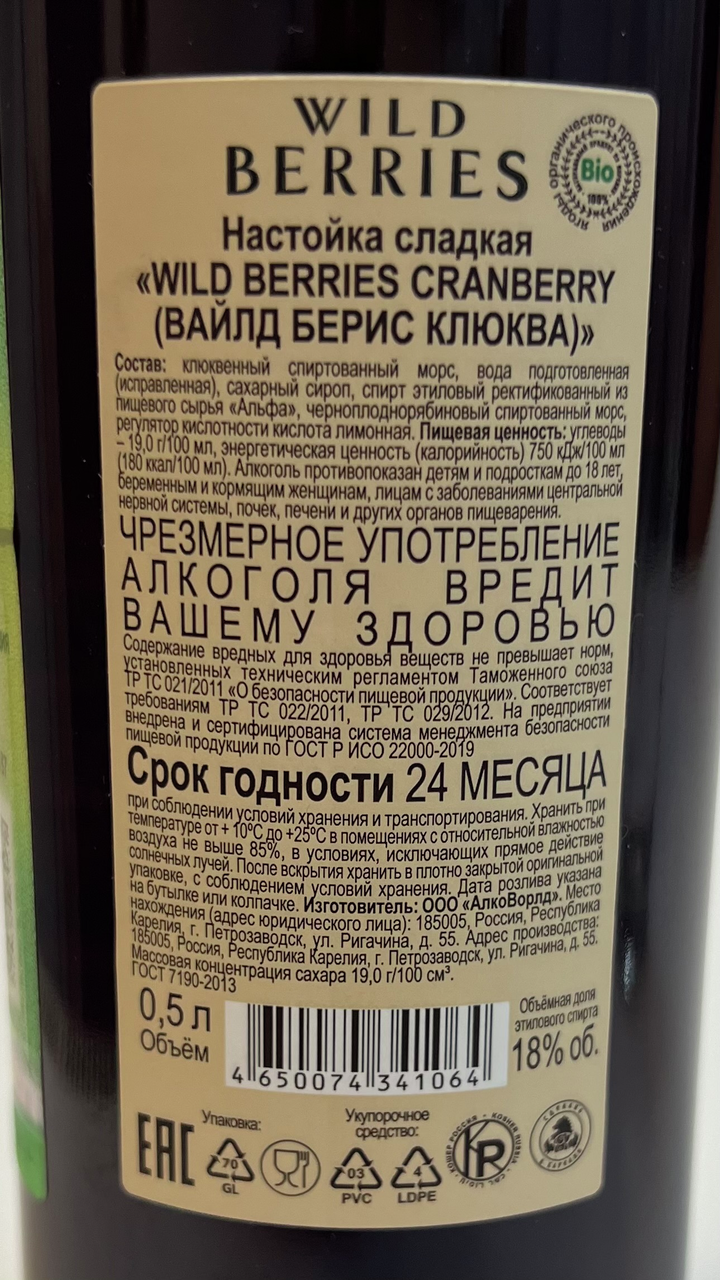 Клюквенный спиртованный морс, вода подготовленная (исправленная), сахарный сироп, спирт этиловый ректификованный из пищевого сырья АЛЬФА, черноплоднорябиновый спиртованный морс, регулятор кислотности кислота лимонная.
