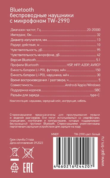 Наушники беспроводные GAL TW-2990 со встроенным микрофоном совместимы с Android/IOS/Windows. Устройства характеризуются полным отсутствием проводов. Скоростной протокол Bluetooth 5.1 поддерживает надежное сопряжение как с телефоном, так и между наушниками. Переносить и хранить их в чистоте и защищать от механических повреждений позволит специально разработанный компактный бокс с магнитными креплениями внутри, легко помещающийся в кармане. С помощью зарядного кейса можно продлить время работы наушников, сам кейс можно подзарядить стандартным кабелем Тype-C, который идет в комплекте. Функция регулировки громкости и перемотка треков. Время зарядки аккумулятора: до 2 часов. Устройство удерживает активное соединение на дистанции до 10 метров.