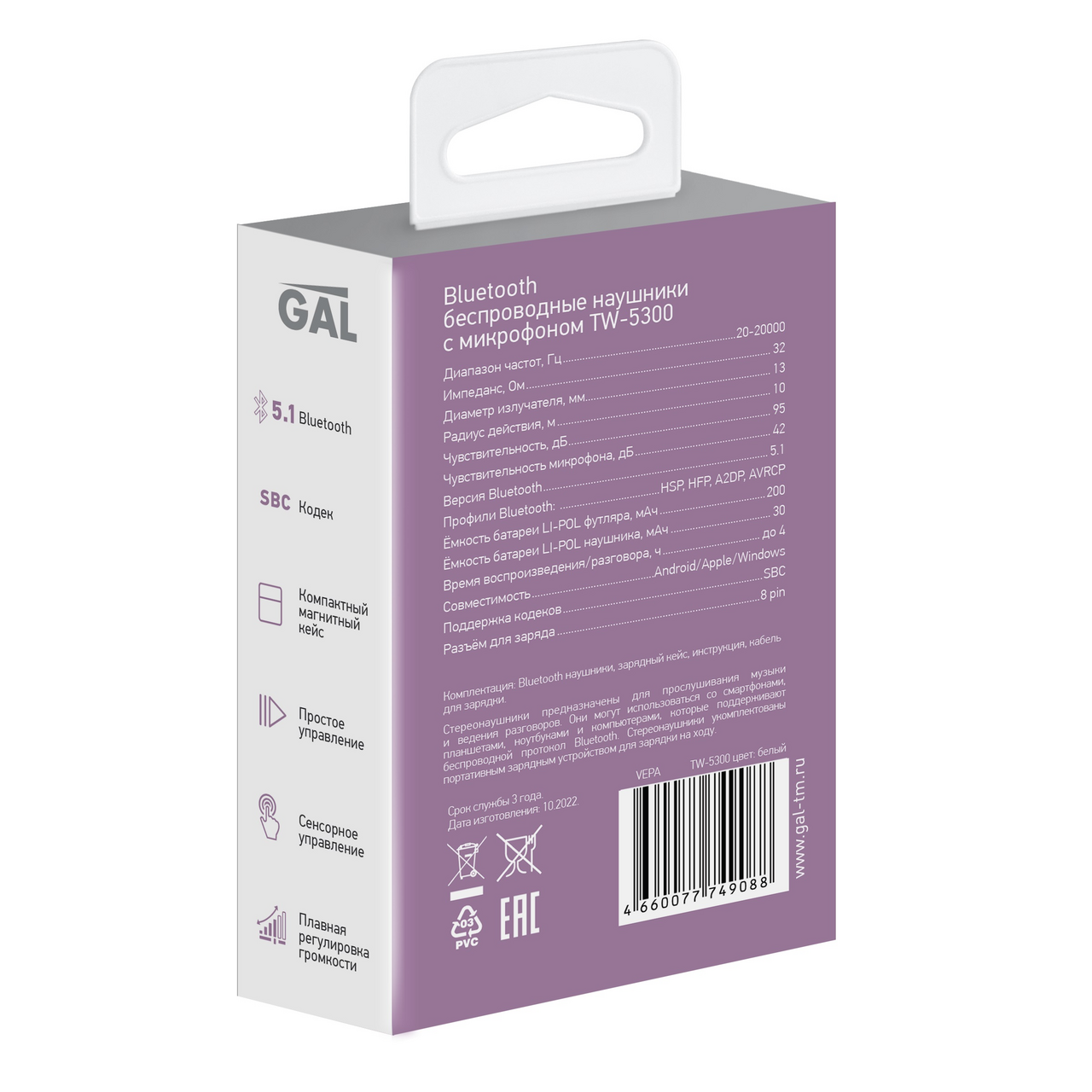 Беспроводные стереонаушники GAL TW-5300 со встроенным микрофоном совместимы с Android/IOS/Windows. Полное отсутствие проводов, сенсорное управление. Скоростной протокол Bluetooth 5.1 поддерживает надежное сопряжение как с телефоном так и между наушниками. Переносить и хранить их в чистоте и защищать от механических повреждений позволит специально разработанный компактный бокс с магнитными креплениями внутри, легко помещающийся в кармане. С помощью зарядного кейса можно продлить время работы наушников, сам кейс можно подзарядить кабелем с разъемом 8pin, который идет в комплекте. Время зарядки аккумулятора: до 1 часа, встроенный микрофон для ответа на вызов. Устройство удерживает активное соединение на дистанции до 10 метров.