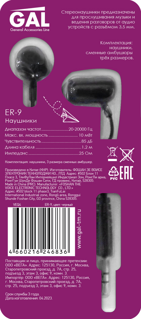Наушники GAL ER-9 черные имеют удобную форму и привлекательный современный дизайн. Мягкие насадки обеспечивают идеальную посадку в ухе и комфортное прослушивание. Устройства позволят в любом месте наслаждаться прослушиванием музыки и просмотром любимых фильмов. Аксессуары имеют удобную форму и привлекательный современный дизайн. Наушники имеют компактные размеры. Они не занимают много места в сумке или рюкзаке, их можно носить в кармане куртки или брюк. Поэтому их удобно брать с собой в поездки и на прогулки.