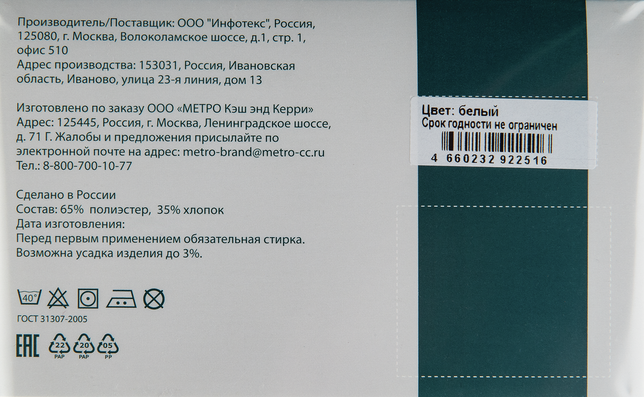 METRO PROFESSIONAL Наволочка белая поликоттон, 70 x 70см