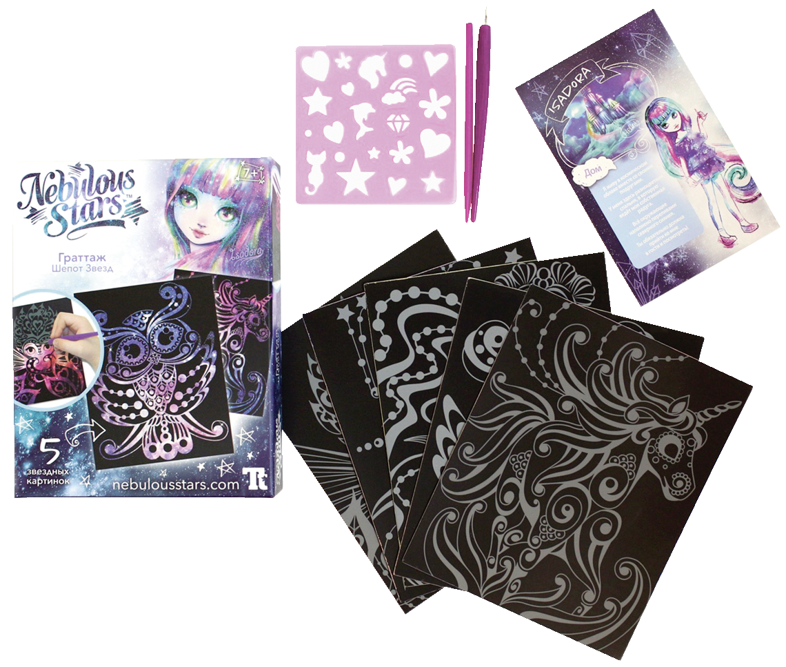 Галактика Nebulous Stars - это сказочный мир творчества и волшебства! Девочки готовы приоткрыть завесу тайны и раскрыть секреты космической силы и магии, проводить тебя в мир добра, красоты и положительных эмоций! Граттаж – это древняя техника нанесения рисунка методом процарапывания заостренным инструментом. Открой для себя красочную галактику в сказочном блеске! В наборе: 5 звездных картинок, 2 инструмента-скребка, 21 трафарет, история звезды Айседоры. Возрастное ограничение 7+