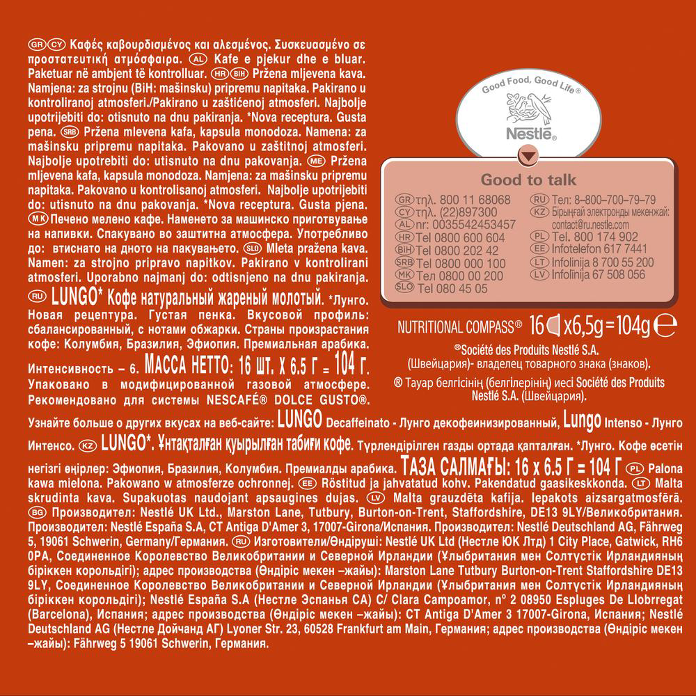 Откройте для себя чарующий лунго от Нескафе Dolce Gusto - притягательный и относительно крепкий кофе средней степени обжарки. Лунго подается в более крупных, чем для эспрессо, чашках (120 мл) и славится своим богатым, изысканным вкусом, насыщенным ароматом и волшебной, бархатистой пенкой. Насладитесь большой чашкой этого удивительного напитка – и яркий аромат обжаренного кофе с волшебным привкусом черной смородины не оставит Вас равнодушным!