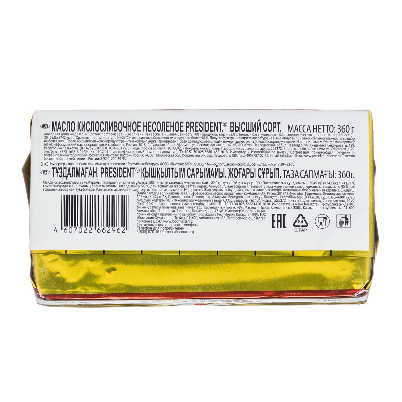 Масло кислосливочное несоленое President высший сорт 82%, 360 г БЗМЖ (без заменителя молочного жира) производится по особому французскому рецепту из ингредиентов, соответствующим стандартам качества. В состав продукта входят только натуральные пастеризованные сливки и закваска. Масло не содержит заменителей молочного жира, искусственных консервантов и ароматизаторов. Благодаря высококачественному сырью и строгому контролю на производстве продукт безопасен для питания людей любых возрастов. Это удачный выбор для тех, кто стремится следить за своим здоровьем. Масло имеет приятный сливочный цвет и аромат, а также однородную консистенцию. Применение закваски при производстве продукта придает ему особый узнаваемый вкус с легкой кислинкой. Масло стане�� оптимальным вариантом для выпечки или бутербродов на завтрак. Кроме того, будет незаменимо для приготовления различных блюд, соусов и кремов. Товар упакован в фольгу, на которой нанесена шкала с делением по 20 г, что очень удобно в применении.
