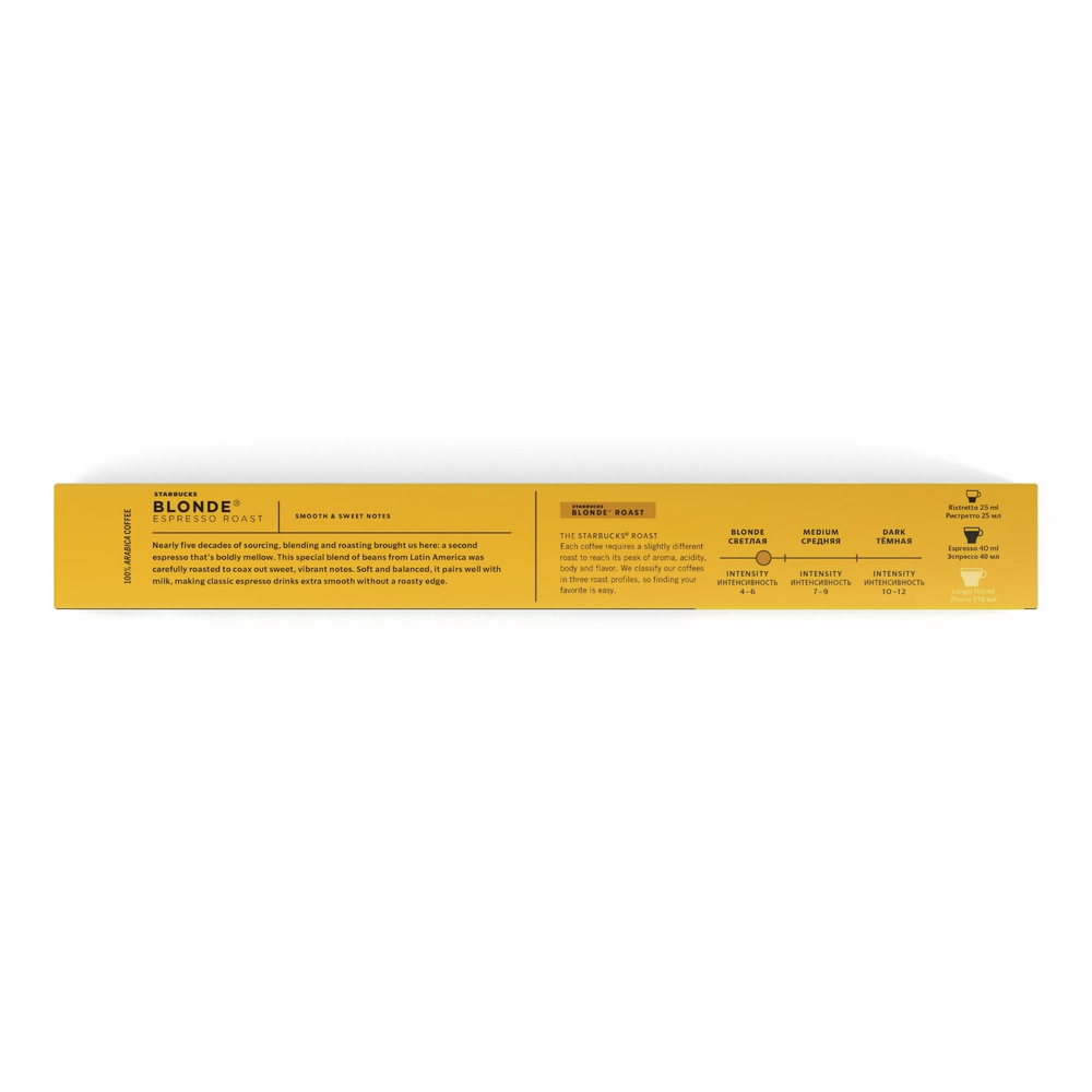 STARBUCKS Blonde Espresso Roast, кофе жареный молотый светлой обжарки, в алюминиевых капсулах для системы Nespresso, 100% Арабика, 10 шт.Ноты: Эспрессо самой слабой обжарки с нежным и мягким вкусом. Интенсивность: 6 из 12Размер чашки: Ристретто (25 мл) или Эспрессо (40 мл).Обжарка: Blonde - светлая, обладает легким и ярким вкусом.Каждый вид кофе требует различной степени обжарки для достижения оптимального соотношения аромата, кислинки, плотности кофе и вкуса. Мы разделяем наш кофе на три вида обжарки Blonde, Medium и Dark, чтобы вы легко могли найти свой любимый кофе.