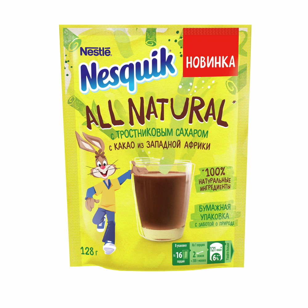 Быстрорастворимый какао-напиток Nesquik All Natural — это настоящее шоколадное удовольствие! И чтобы насладиться им не придется долго ждать, ведь достаточно растворить пару ложек какао в молоке или горячей воде. Сладкий напиток без искусственных красителей и консервантов обязательно оценят и дети, и взрослые.