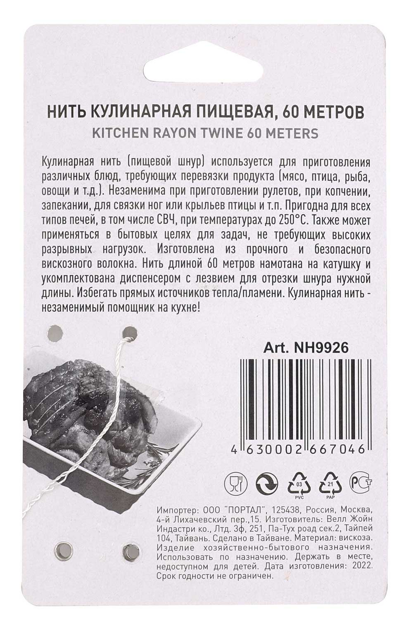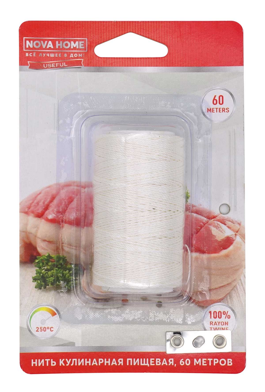 Нить кулинарная Nova Home пищевая, 60м используется для приготовления различных блюд, требующих перевязки продукта (мясо, птица, рыба, овощи и т.д.). Незаменима при приготовлении рулетов, при копчении, запекании для связки ног или крыльев птицы и т.п. Пригодна для всех типов печей, в том числе СВЧ, при температурах до 250 С. Также может применяться в бытовых целях для задач, не требующих высоких разрывных нагрузок. Изготовлена из прочного и безопасного вискозного волокна. Нить, длиной 60 м намотанная на катушку, укомплектована диспенсером с лезвием для отрезки шнура нужной длины. Избегать прямых источников тепла/пламени. Кулинарная нить – незаменимый помощник на любой кухне! Длина нити: 60 м