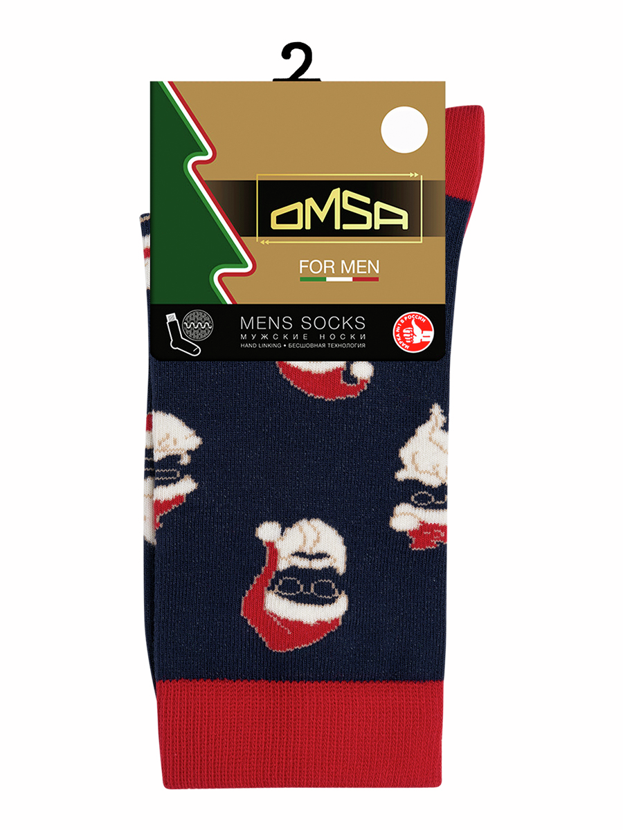 Мужские новогодние носки Omsa с праздничным рисунком. Благодаря широкой и удобной резинке идеально облегают, а кеттельный (плоский) шов на мыске создает дополнительный комфорт. Хлопок в составе обладает высокой воздухопроницаемостью, отлично впитывает влагу и приятен на ощупь. Устойчивы к истиранию и отлично сохраняют цвет. Стильный и оригинальный аксессуар, который станет прекрасным подарком на грядущий Новый год. Позитивный и яркий рисунок в виде Деда Мороза создает отличное настроение и идеально соответствует праздничной атмосфере.