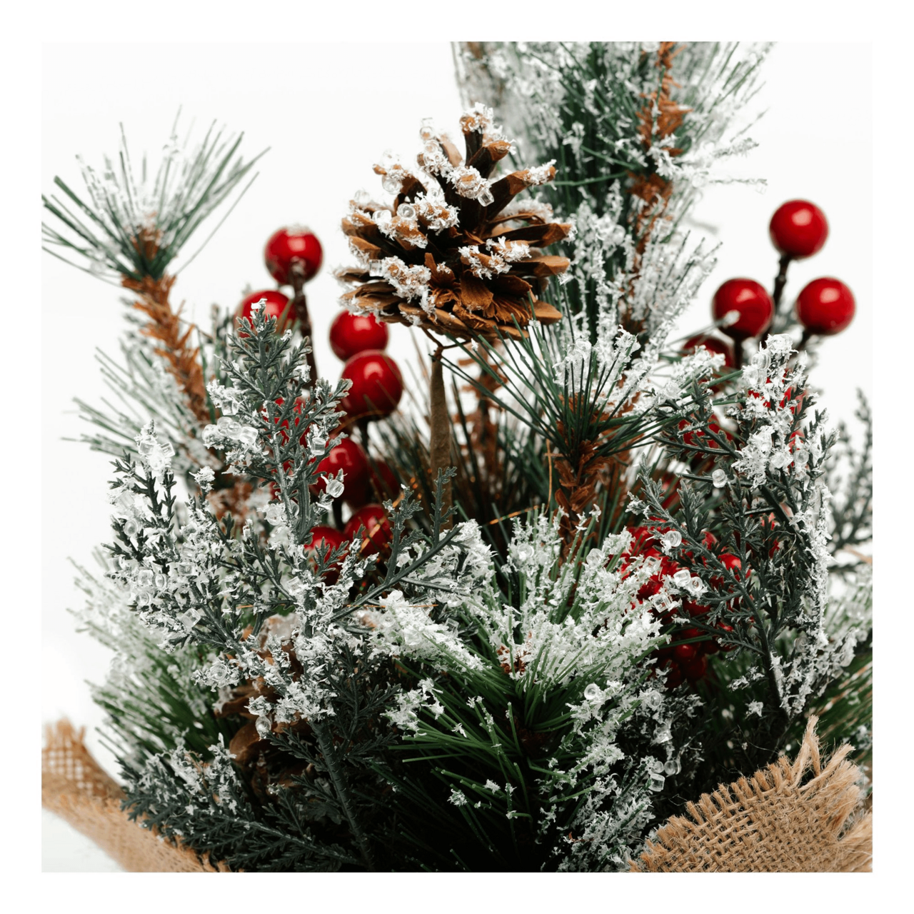 Елочку удобно использовать для декорирования любого интерьера, ведь она не займет много места. Сама елочка выглядит довольно реалистично, а ее веточки украшены декоративными шишками и красными ягодками. Основание елочки спрятано в текстильный мешочек, что создает еще больше тепла и уюта в преддверии праздника.