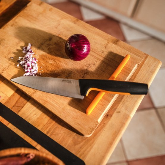 Средний поварской нож Fiskars Functional Form™ разработан для легкой ежедневной работы и прост в уходе^Отлично подходит для нарезки мяса, овощей, зелени ^Прочное лезвие из японской нержавеющей стали^Длина лезвия 169 мм^Твердость стали HRC 52 ^Высокая производительность резки (по результатам CATRA теста)Ножи Fiskars Functional Form™ разработаны для тех, кто ценит продуманные, но в то же время простые в уходе кухонные инструменты, которые станут универсальными помощниками на любой кухне. Обновленная линейка ножей Functional Form™ для повседневного использования. Улучшенная производительность резки, по сравнению с предыдущей линейкой ножей Functional Form. Высококачественная японская нержавеющая сталь обеспечивает отличную остроту и коррозионную стойкость. Эргономичная ручка ножей имеет нескользящее покрытие SoftGrip ™, а упор для пальцев обеспечит безопасность во время работы. Длинный хвостовик обспечивает отличный баланс и долговечность. Ножи Functional Form™ просты в уходе, при необходимости их легко заточить: рекомендуется заточка с помощью точилки Fiskars Roll-Sharp ™ или точильного камня с углом 30+/-4. Все ножи Functional Form ™ можно мыть в посудомоечной машине. Разработано в Финляндии.