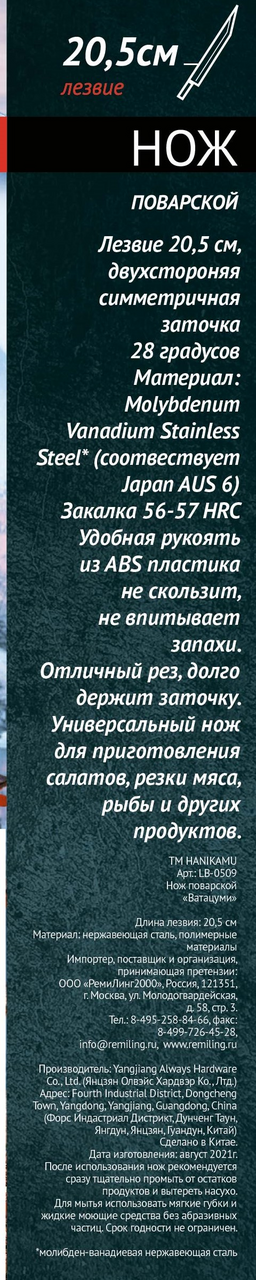 Нож поварской Ватацуми Благодаря двухсторонней симметричной заточке 28 градусов, нож долго не тупится, у него получается отличный рез. Удобная рукоять из ABS пластика не скользит, не впитывает запах. Универсальный нож для приготовления. После использования нож рекомендуется сразу тщательно помыть от остатков продуктов и вытереть насухо. Для мытья использовать мягкие губки и жидкие моющие средства без абразивных частиц.