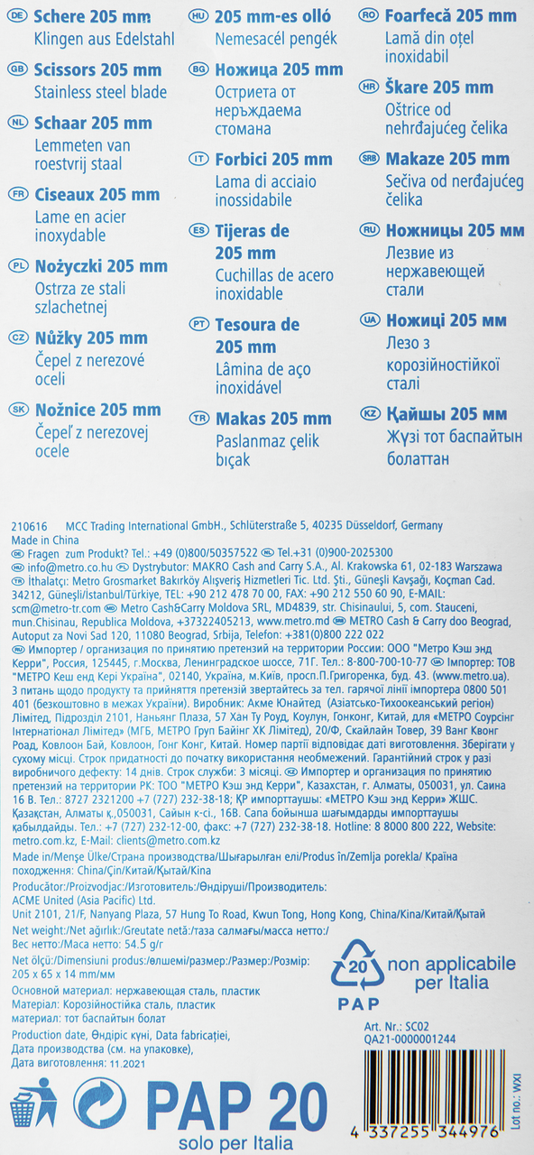Ножницы aro с длиной лезвия 20,5 см — одна из основных офисных принадлежностей, предназначенная для резки бумаги и картона. Ножницы изготовлены из нержавеющей стали высокого качества, которая обеспечивает их рабочее состояние даже в условиях частого контакта с водой или влажными предметами. Достаточно широкие и длинные пластиковые ручки удобны в работе даже для больших рук, гладкая форма не даст пальцам быстро устать и не создает дискомфорта. Симметричная форма колец не требует соблюдения одного положения ножниц, что позволяет оперативно использовать их при первой необходимости. Широкое основание ножниц обеспечивает дополнительную надежность инструмента. Края кончиков закруглены для безопасного использования.