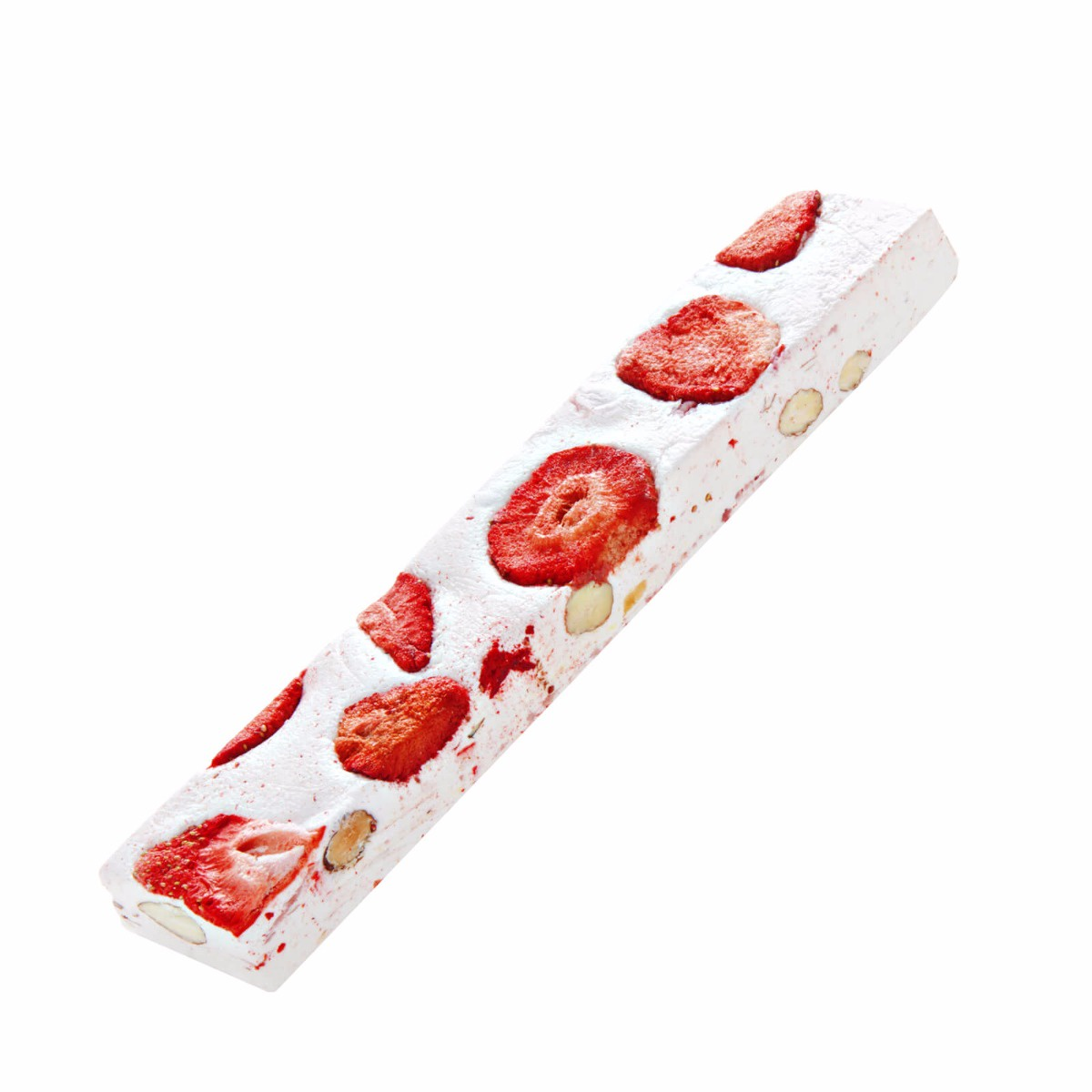 Нуга серии "Passion" - это специально созданная коллекция нуги, которая приятно удивит даже самого взыскательного покупателя. Вкусы от классического до самого необычного! Смесь нуги изготавливается по оригинальному рецепту 1925 года: обогащена сбалансированной смесью жареного цельного миндаля и фундука с добавлением цельнымых ягод клубники. Нугу готовят на традиционном торроне, разливают в горячем виде и замешивают вручную, чтобы сохранить её мягкость. Тесто обогащено мягким клубничным кондидерсктим кремом. Ягоды уложены ручным способом, чтобы сохранить целостность и оригинальность клубники.