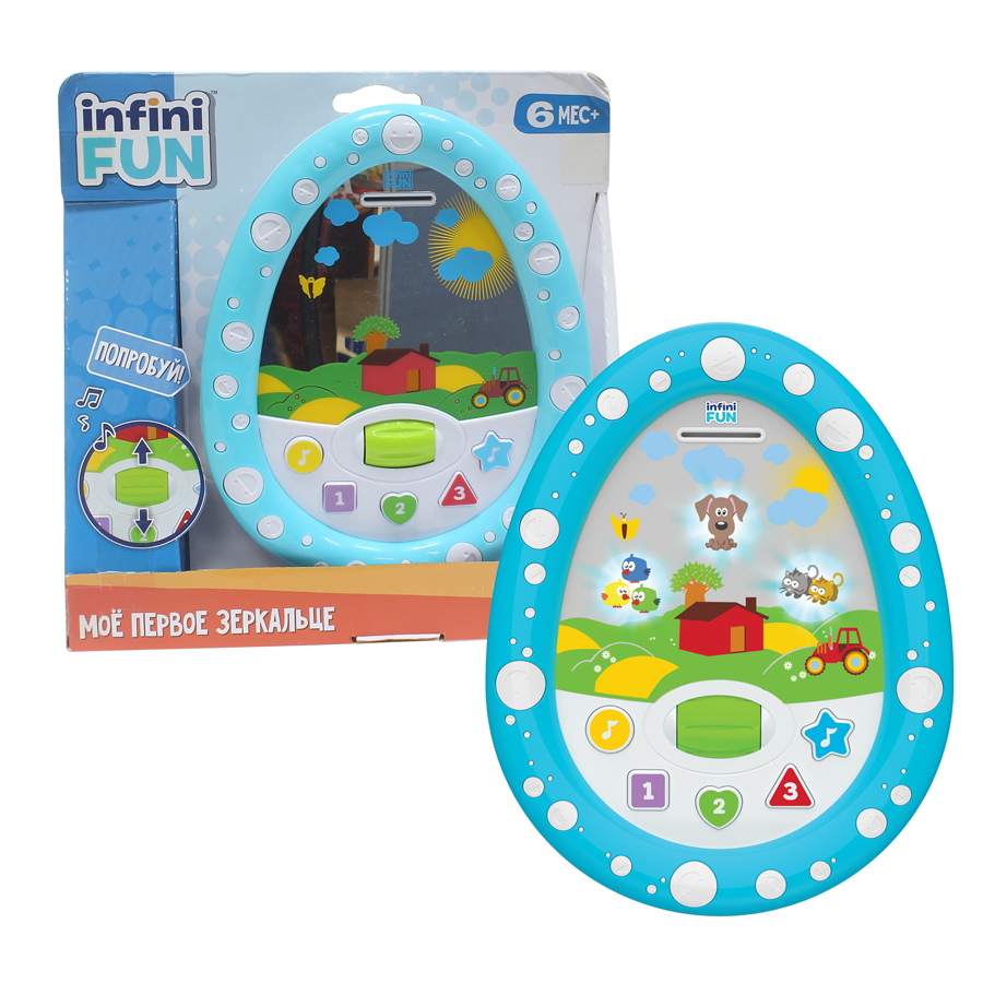 Электронное зеркальце - это не просто игрушка, в которой можно также увидеть свое отражение, а это увлекательный игровой предмет. Внизу расположено 5 кнопок разных цветов - при нажатии на каждую из них зеркальце называет форму, цвет или цифру от 1 до 3, или проигрывает мелодию. Но самое интересное то, что на зеркальной поверхности игрушки при нажатии на кнопки проявляются картинки с подсветкой, одна за другой, как на экране. Возрастное ограничение от 5 мес