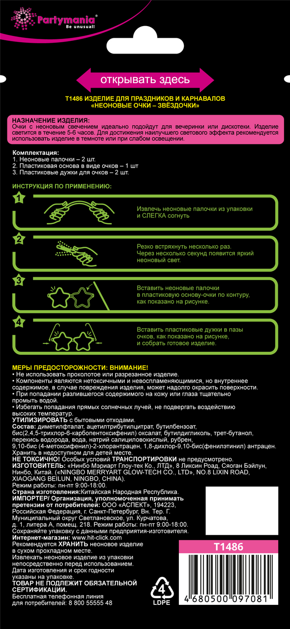 Используются для праздников, карнавалов, дискотек. Создают оригинальный образ благодаря эффекту интенсивного неонового свечения и форме в виде звёздочек. Изделие светится в течение 5-6 часов.