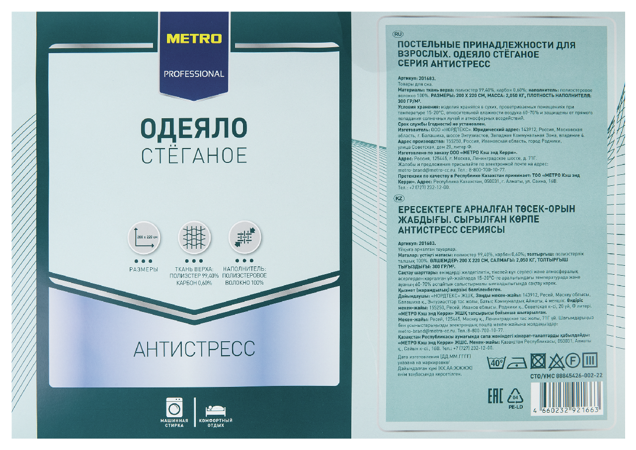 METRO PROFESSIONAL Одеяло полиэстер 100% серия антистресс, 200 x 220 см — это идеальное решение для комфортного отдыха и расслабления. Одеяло очень мягкое и уютное, оно сочетает в себе качество, стиль и функциональность, чтобы сделать дом еще более комфортным. Рассмотрим преимущества этого продукта: — Высококачественный полиэстер. Одеяло изготовлено из 100% полиэстера, который является прочным и долговечным мат��риалом. Оно невероятно мягкое и хорошо дышит, но в то же время сохраняет тепло в холодные дни, а также обеспечивает комфорт в более теплую погоду. — Серия антистресс. Это одеяло было специально разработано для создания атмосферы спокойствия и релаксации. Оно имеет особую структуру, которая мягко обволакивает тело, создавая ощущение безмятежности и умиротворения. Серия антистресс обещает принести покой и умиротворение после долгого и напряженного дня. — Легкое и мобильное. Одеяло очень легкое и удобное для переноски. Можно использовать его в спальне, гостиной, на открытой веранде или даже во время отдыха на природе. Благодаря своей портативности и легкости, его можно взять с собой куда угодно и наслаждаться комфортом и уютом в любое время. — Прост��та ухода. Одеяло из полиэстера не требует особого ухода. Оно легко стирается в машине, оставаясь мягким и пушистым после каждой стирки. Можно поддерживать чистоту и гигиену одеяла без особых сложностей. METRO PROFESSIONAL Одеяло серия антистресс — верный спутник в поиске уюта и комфорта. Создайте свой собственный оазис спокойствия с помощью мягкого и уютного одеяла, которое сочетает в себе качество, стиль и функциональность. Дайте себе возможность расслабиться и насладиться комфортом с METRO PROFESSIONAL!