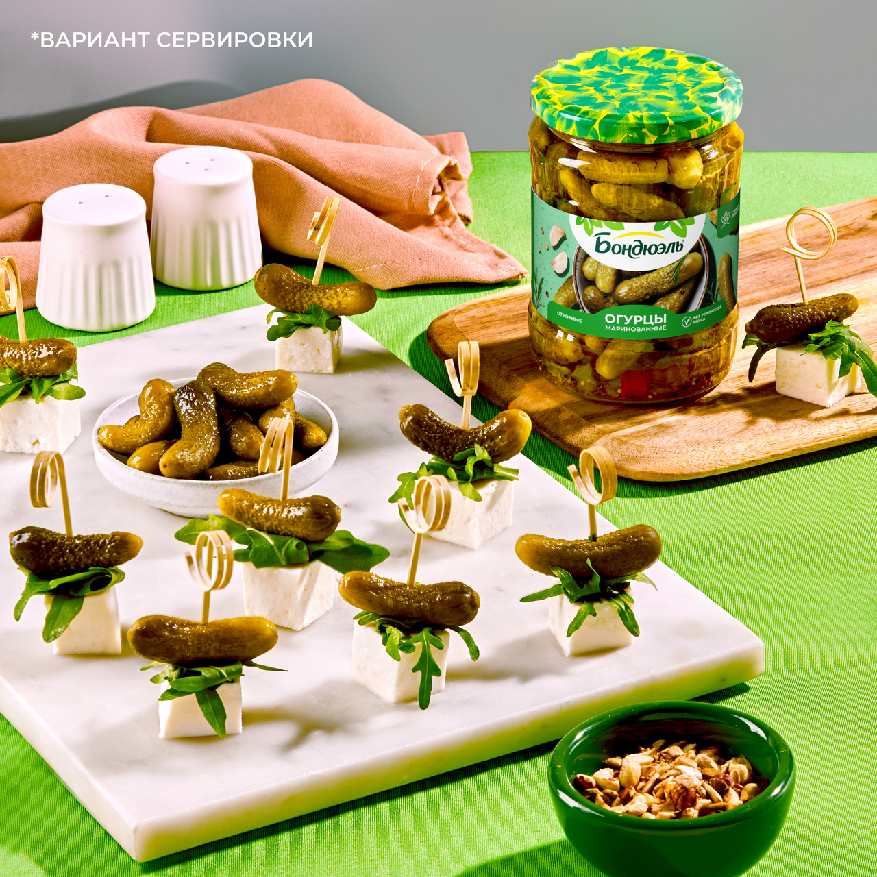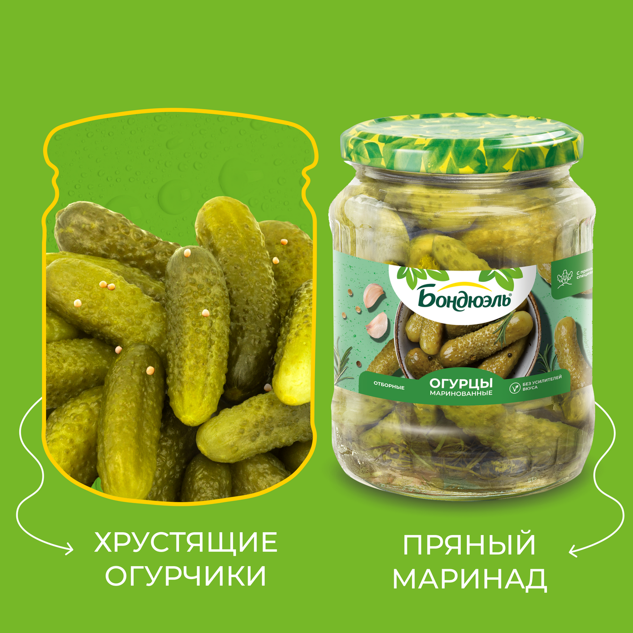 Огурцы, вода питьевая, соль поваренная пищевая, регулятор кислотности: уксусная кислота, укроп, зерна горчицы, лук, красный перец, уплотнитель: хлорид кальция, натуральные ароматизаторы, подсластитель: сахарин.