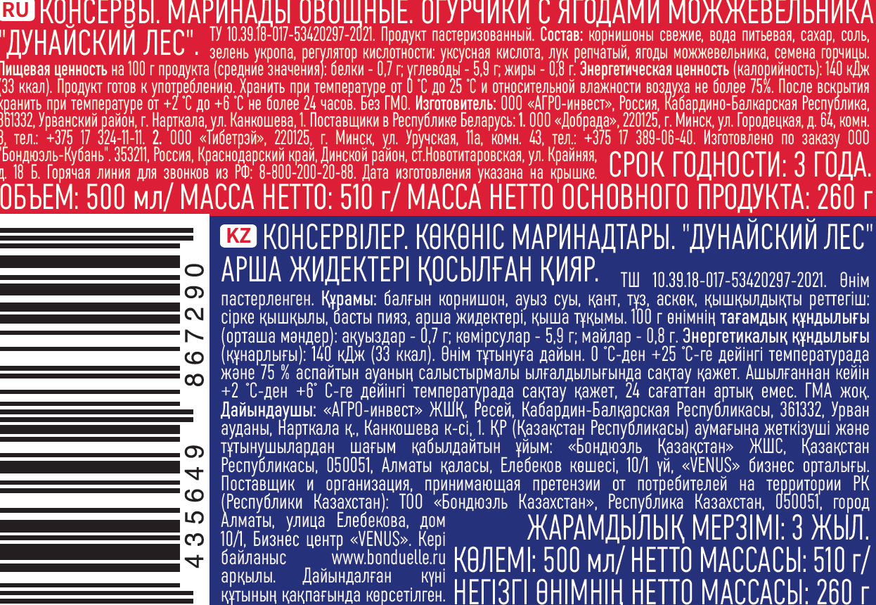 Корнишоны свежие, вода питьевая, сахар, соль, зелень укропа, регулятор кислотности: уксусная кислота, лук репчатый, ягоды можжевельника, семена горчицы.