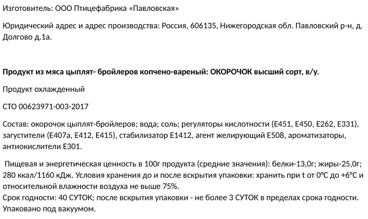 Окорочок цыпленка-бройлера Павловская курочка копчено-вареная, ~600г