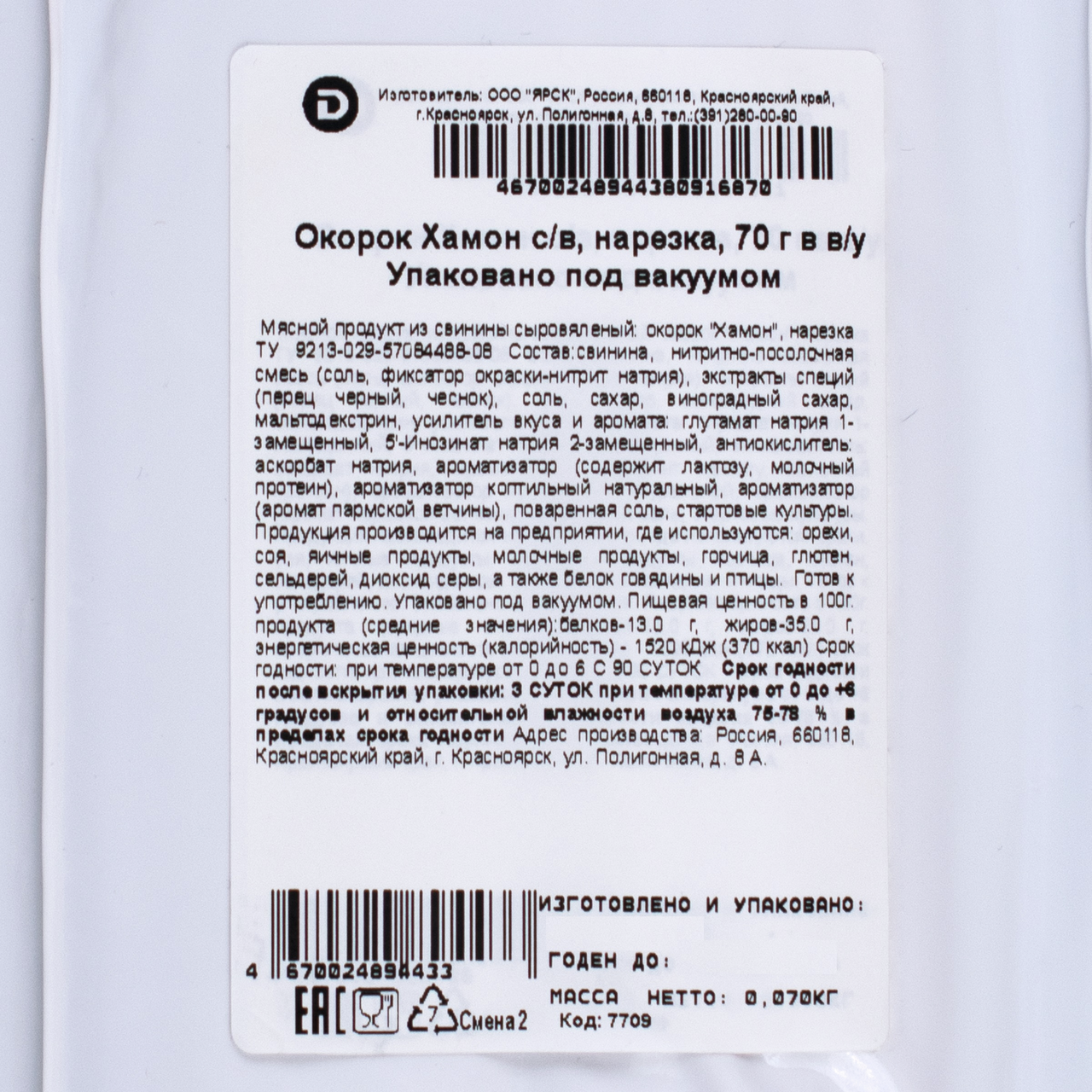 - Тип упаковки Вакуумная упаковка