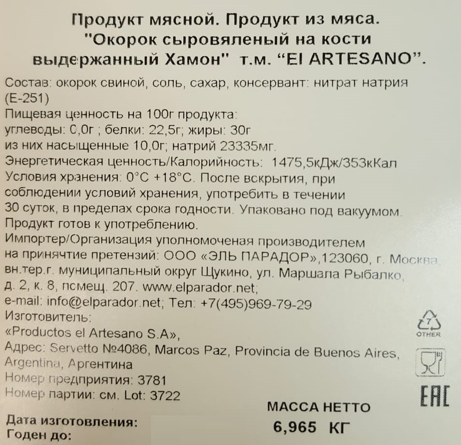Хамон El Artesano сыровяленый на кости, ~8кг