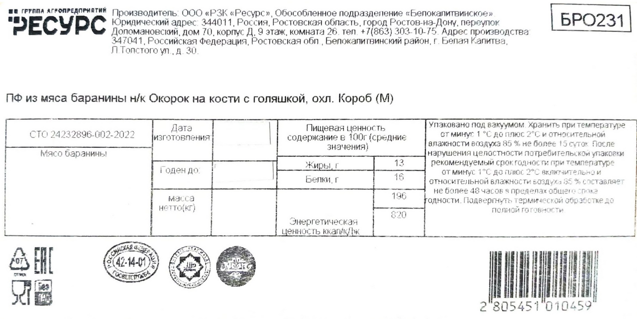 Окорок из мяса баранины на кости с голяшкой охлажденный, ~3кг