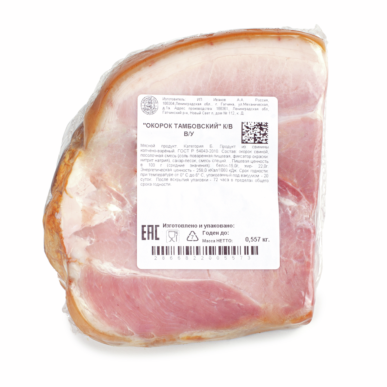 Варено-копченый деликатес из свинины. Бескостный цельный кусок включает нежную мякоть и прослойки жира. Сочный окорок обладает приятным натуральным вкусом, который деликатно подчеркивают пряности. Деликатес подойдет для приготовления бутербродов и сэндвичей. Особенно вкусно сочетать его с зеленью, дижонской горчицей, свежими овощами и творожным сыром. Окорок также можно просто нарезать кусочками и подать в качестве самостоятельной закуски или дополнения к гарнирам.