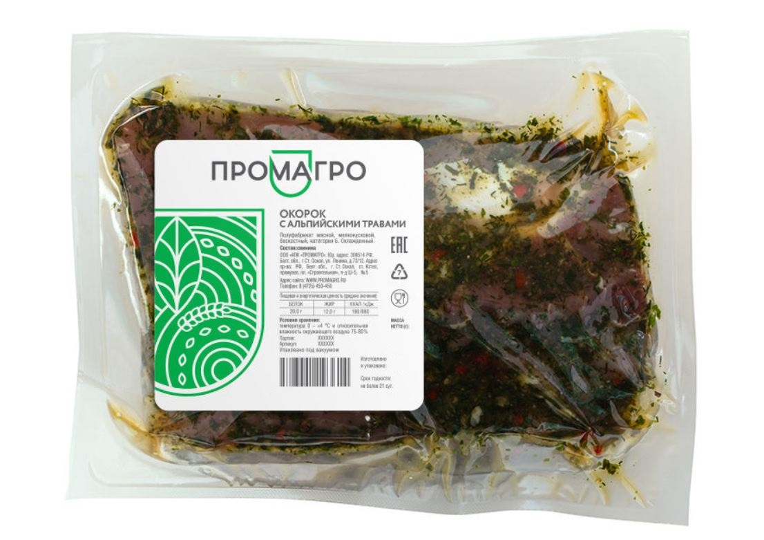 Окорок с альпийскими травами охлажденный Промагро весом 0,9-1,1 кг упакован в вакуумный пакет, в котором сохраняет пищевую ценность и вкусовые характеристики при должных условиях хранения. Свиной окорок — одна из самых деликатесных частей свинины. Мясо на этом участке лишено огромного количества жира, поэтому отличается нежной структурой. Оно одинаково подходит для запекания, маринования, соления и жарки. Окорок также можно подавать с горячими и охлажденными блюдами, в составе бутербродов, сэндвичей. Особый аромат ему придают душистые альпийские травы, а в качестве гарнира используются моченые яблоки, тушеная капуста. Полностью раскрыть аромат мяса помогут клюквенный и горчичный соусы. Приобрести окорок с альпийскими травами охлажденный Промагро весом 0,9-1,1 кг можно в торговом центре METRO.Бренд: Промагро.Страна: Россия.Производитель: Промагро АПК ООО.Вид крупнокускового мяса: окорок (бедро).Вид мяса: свинина с альпийскими травами.Термическая обработка: охлажденный.Тип упаковки: вакуумная.Пищевая ценность (на 100 г продукта): белки — 19 г, жиры — 7,5 г.Энергетическая ценность: 140 ккал.Рекомендации по приготовлению: маринование, соление, жарка, запекание.Состав: свинина, специи, маринад.Особенности: без ГМО, может содержать следы сои, глютена, горчицы, сельдерея.Условия хранения: после вскрытия упаковки хранить при температуре от -1,5 до 4С и относительной влажности воздуха не более 75%.Срок годности: 20 суток.Вес: в пределах 0,9-1,1 кг.