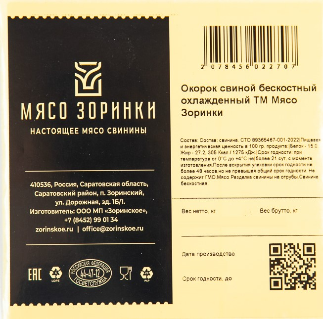 Окорок свиной Мясо Зоринки бескостный охлажденный, ~2кг