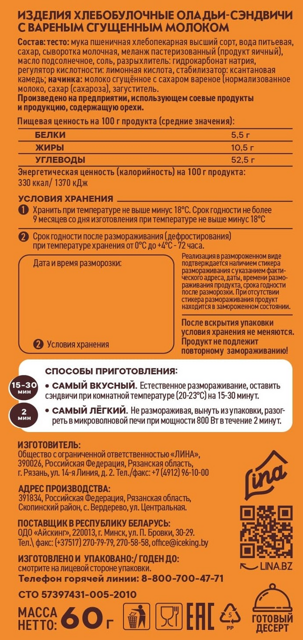 Тесто: мука пшеничная хлебопекарная высший сорт, вода питьевая, сахар, сыворотка молочная, меланж пастеризованный (продукт яичный), масло подсолнечное, соль, разрыхлитель: гидрокарбонат натрия, регулятор кислотности: лимонная кислота, стабилизатор: ксантановая камедь; начинка: молоко сгущённое с сахаром варёное (нормализованное молоко, сахар (сахароза), загуститель.