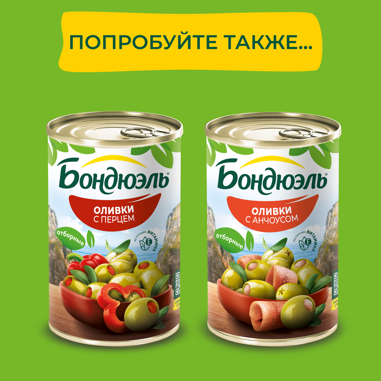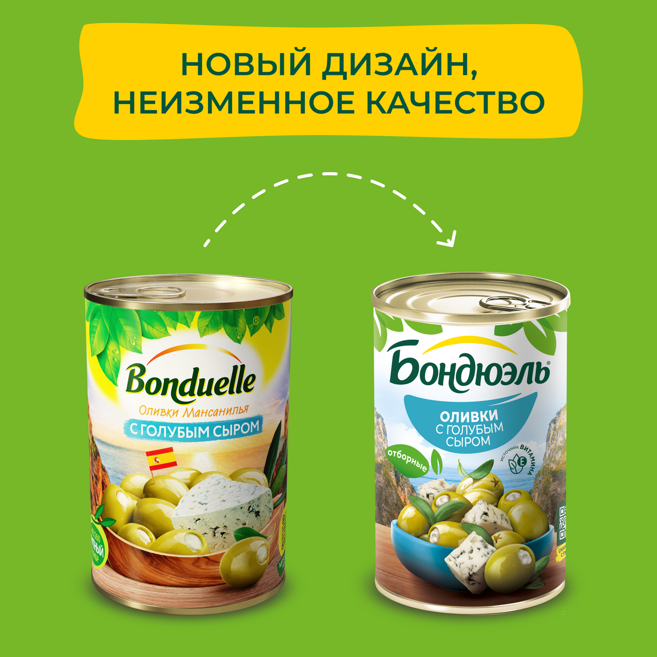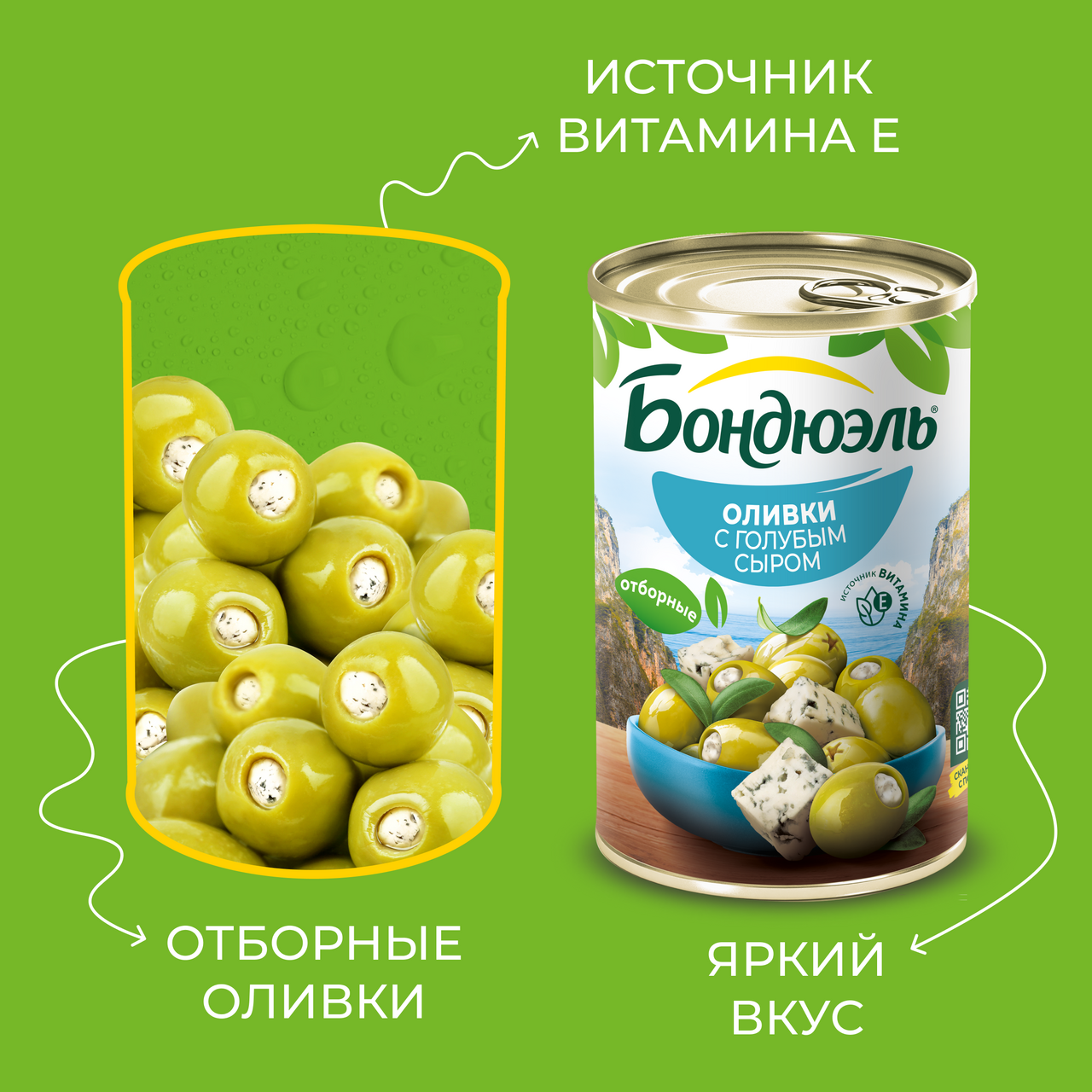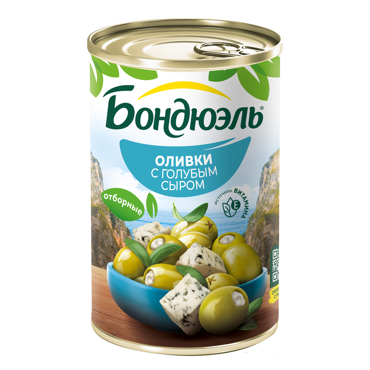 Гурманам посвящается новый продукт Бондюэль - оливки, фаршированные голубым сыром. Выращенные в испанской Андалусии, крупные, очень сочные оливки сорта Мансанилья обрели французский шарм. Слаженный дуэт представителей кулинарии разных стран прекрасен как закуска. Они станут хорошим аккомпанементом к блюдам из мяса или из птицы. Положите несколько оливок на сырную тарелку - это будет восхитительное сочетание.