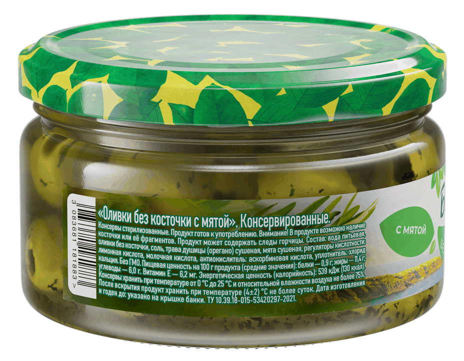Вода питьевая, оливки без косточки, соль, трава душицы орегано сушеная, мята сушеная, регуляторы кислотности: лимонная кислота, молочная кислота, антиокислитель: аскорбиновая кислота, уплотнитель: хлорид кальция.
