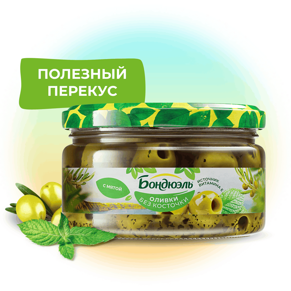 Бондюэль предлагает новинку - зеленые оливки с мятой в стеклянной баночке 250мл, чтобы добавить яркости и вкуса вашему рациону. А еще они 100% натуральные, богаты витамином Е, омегой и жирами.