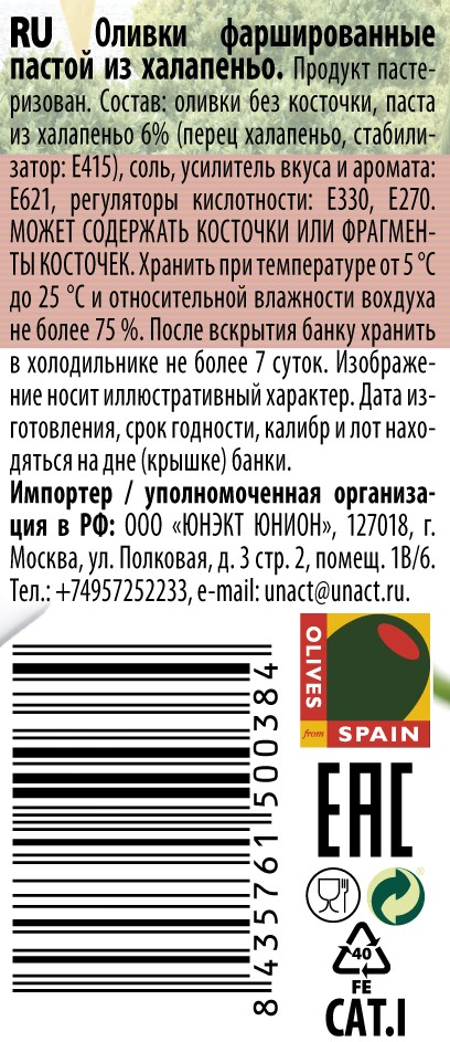 Оливки без косточки, вода питьевая, паста из халапеньо вода, перец халапеньо, стабилизатор Е415 соль, усилитель вкуса и аромата Е621, регуляторы кислотности Е330, антиокислитель Е300.