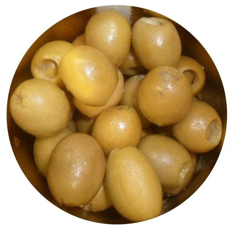Вода, оливки, паста из лимонов 6% (вода, лимон, стабилизатор: Е401, Е407), соль, усилитель вкуса и аромата: Е621, регуляторы кислотности: Е330, Е270, антиокислитель: Е300, ароматизатор идентичный натуральному.