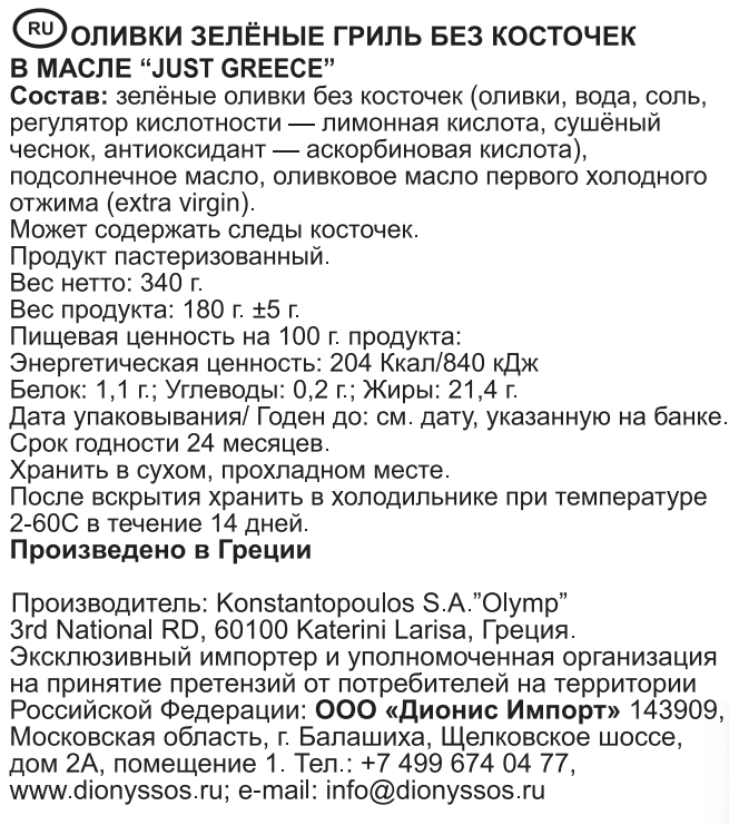 Оливки зеленые Just Greece Гриль без косточки в масле, 340г