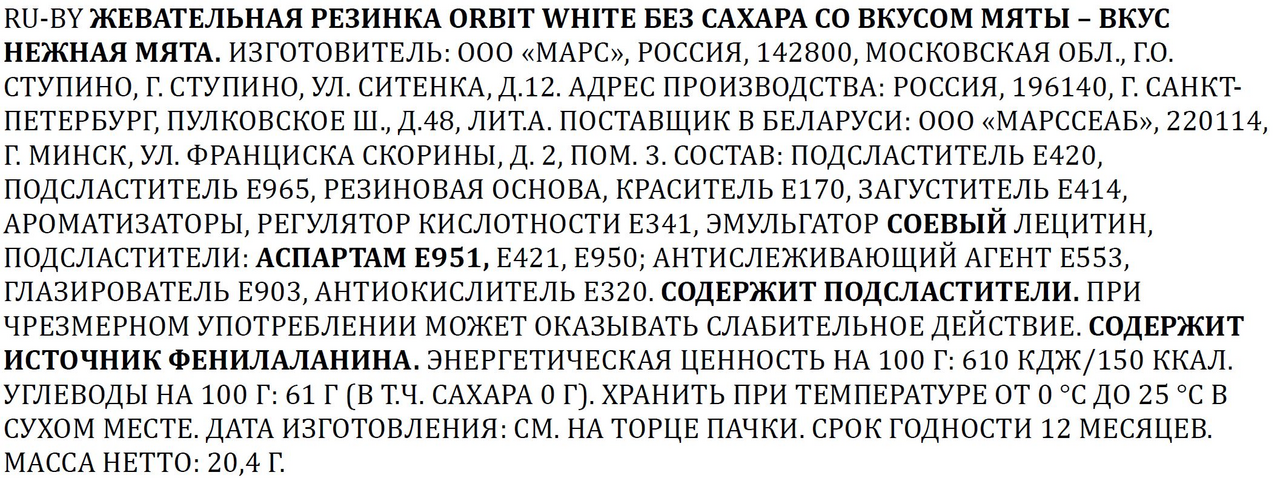 Orbit White XXL Нежная мята - это жевательная резинка без сахара, которая дарит внутреннее ощущение уверенности, так необходимое нам в личной жизни, профессиональных и даже мелких бытовых ситуациях. - Попробуйте Orbit White XXL Нежная мята и получите ощущение свежести и заряд уверенности в нужный момент. - Жевательная резинка Orbit без сахара помогает поддерживать здоровье зубов: удаляет остатки пищи, способствует уменьшению зубного налета, нейтрализует вредные кислоты, усиливает процесс реминерализации эмали. - Употребление жевательной резинки каждый раз после еды способствует поддержанию чистоты и здоровья зубов в дополнение к уходу за ротовой полостью с помощью зубной щетки. - Жевательная резинка Orbit без сахара позволит встретить мир с улыбкой!