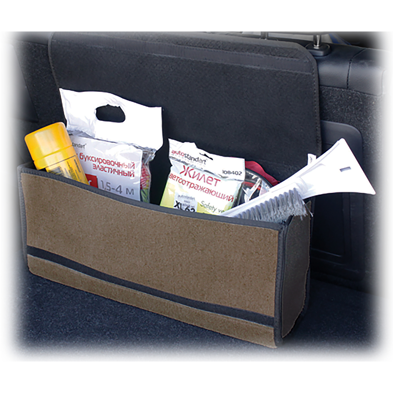 Органайзер в багажник Autostandart 50 х 24 х 12см выполнен в форме сумки. Модель дополняется тремя внешними сетчатыми секциями. В карманах можно хранить много различных мелочей, необходимых в дороге. Приспособление вместительное, благодаря ему в багажнике всегда будет порядок, а все предметы, инструменты – сложены в одном месте. Органайзер быстро и надежно прикрепляется к обшивке и не смещается во время движения автомобиля. Для этого в нем предусмотрены специальные липучки. В случае переноски багажный органайзер удобно взять за ручку. Изделие выполнено из натурального текстиля. Войлочный материал обладает высокой плотностью, прочностью и хорошими антибактериальными свойствами. В нем не заводятся различные бактерии, плесень. Войлок износостойкий, устойчивый к истиранию, поэтому выдерживает длительную эксплуатацию.