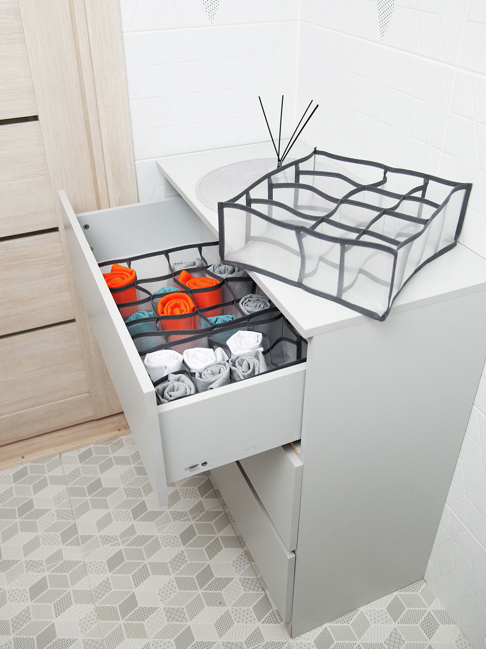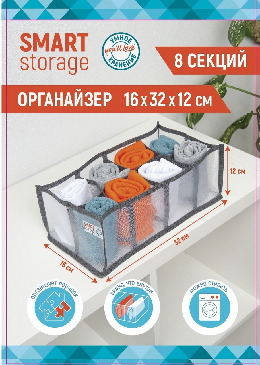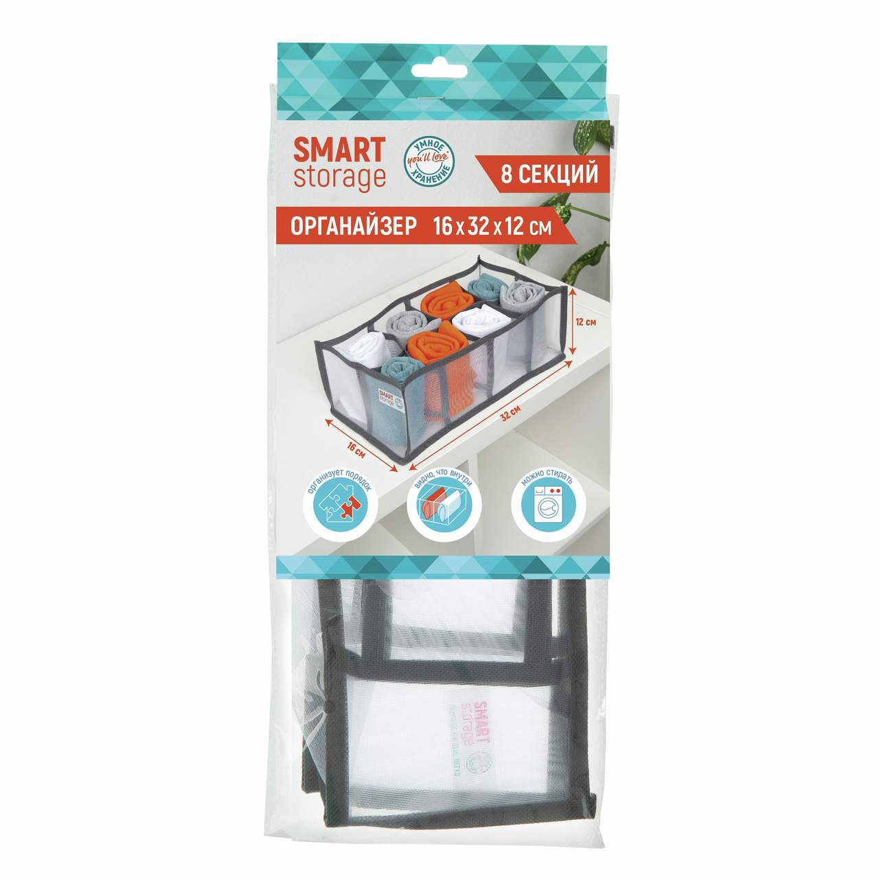 Smart Storage - организация чистого пространства с помощью базовых аксессуаров. Smart Storage это современный подход к организации хранения: небольшой размер органайзера 32*16*12см позволяет организовать порядок на любых полках и ящиках. 8 секций, каждая 8*8см – оптимальны для хранения нижнего белья, носочно-чулочных изделий. Органайзер изготовлен из плотной и прочной нейлоновой сетки. Мягкий и подстраивающийся под объём вещи. Можно стирать. Нейтральный дизайн впишется в любую гардеробную. Сочетается с другими размерами органайзеров Smart Storage для создания идеального порядка.