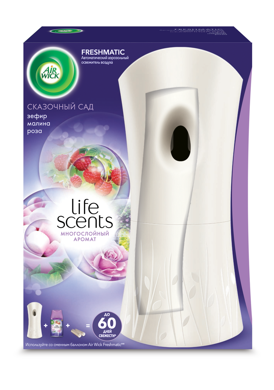 Автоматический освежитель воздуха Air Wick Freshmatic – это небольшое стильное устройство, которое автоматически борется с неприятными запахами* день за днём. Аромат "Сказочный сад" наполнит Ваш дом изысканными нотками зефира и малины в сочетании с лепестками розы. Вставьте сменный баллон в элегантное устройство, выберите интенсивность распыления и наслаждайтесь изысканными ароматами Air Wick