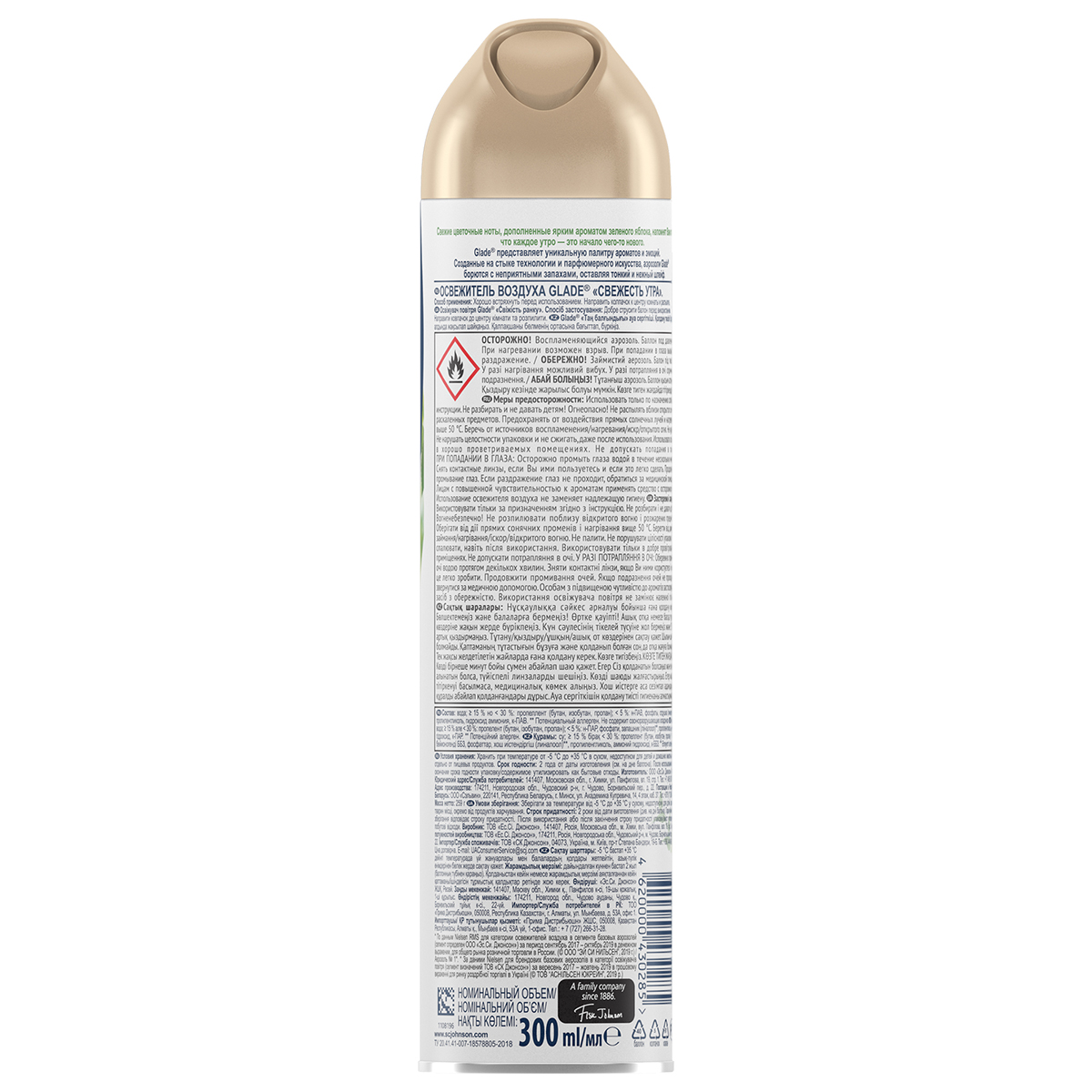 Glade Аэрозоль "Свежесть утра" устраняет запахи, освежает воздух и сохраняет свежесть надолго. Glade "Свежесть утра" соединил в себе самые свежие и нежные ароматы, наполнив Ваш дом свежестью, он превратит его в маленький оазис и подарит незабываемое ощущение утренней прохлады. Аэрозоли Glade легко устраняют неприятные запахи, оставляя свой тонкий и нежный шлейф. Glade TrueScent Technology гарантирует безопасность и экспертную формулу своих аэрозолей для создания ощущения чистоты. Glade (Глейд) Аэрозоль освежитель воздуха устраняет неприятные запахи и мгновенно освежает воздух, наполняя его приятным ароматом. Подходит для дома для туалета для ванной и других помещений. Предназначен для борьбы со стойкими неприятными запахами и мгновенного освежения воздуха в ванной комнате. Используйте продукцию Glade в качестве последнего штриха после уборки, чтобы наполнить комнату свежестью. В коллекции есть большое количество ароматов.