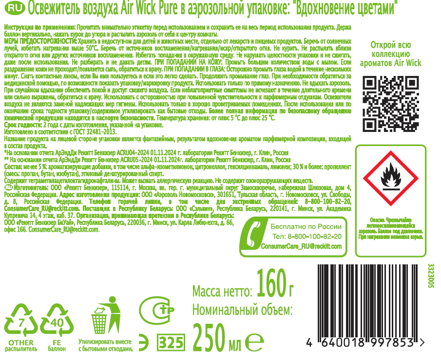Менее 5%: ароматизирующие добавки (в том числе цитраль, лимонен, линалоол); 30% и более: пропеллент (смесь: пропан, бутан, изобутан), этиловый денатурированный спирт.