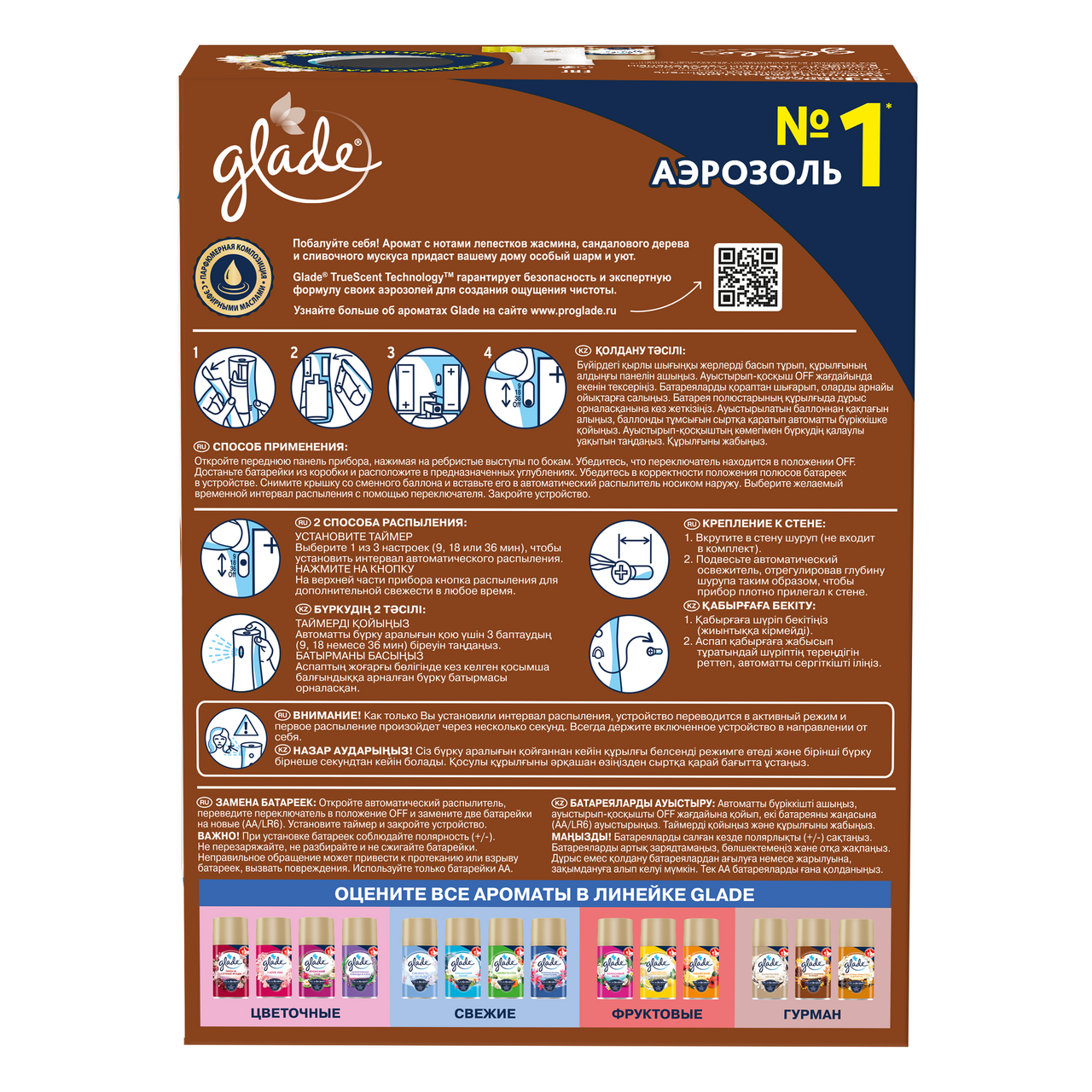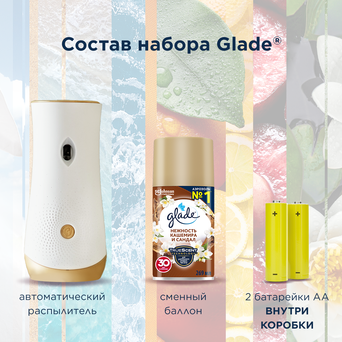 Универсальный сменный аэрозольный баллон Glade Нежность кашемира и сандал для автоматического освежителя воздуха. Меньший размер частиц создает идеальное распыление и распространяет аромат на большие расстояния. Приятный аромат превратит ваш дом в благоухающий сад, наполненный волнительными нотами расцветающей природы. Действует до 60 дней.